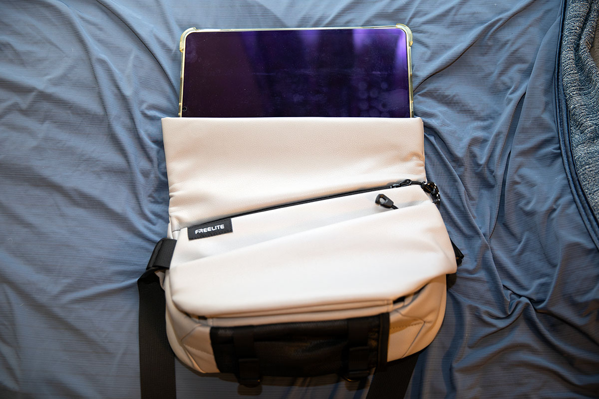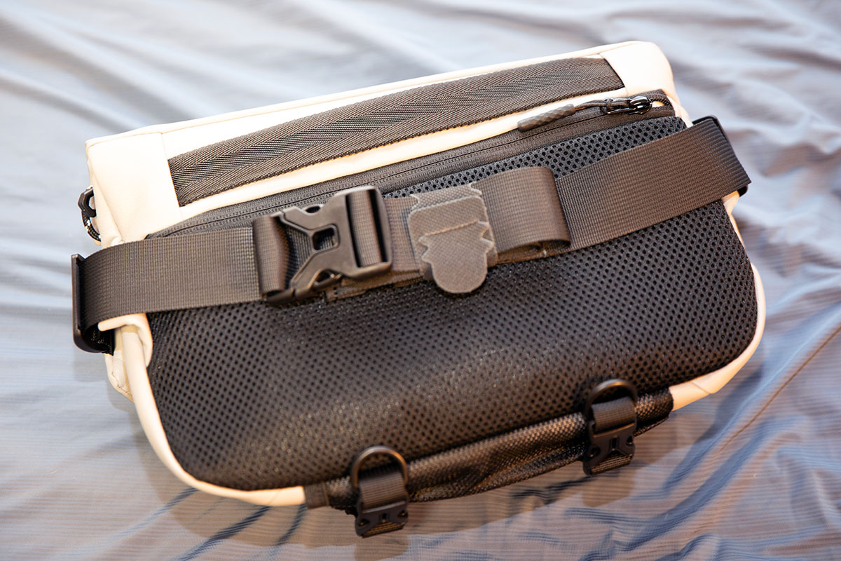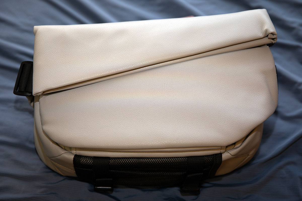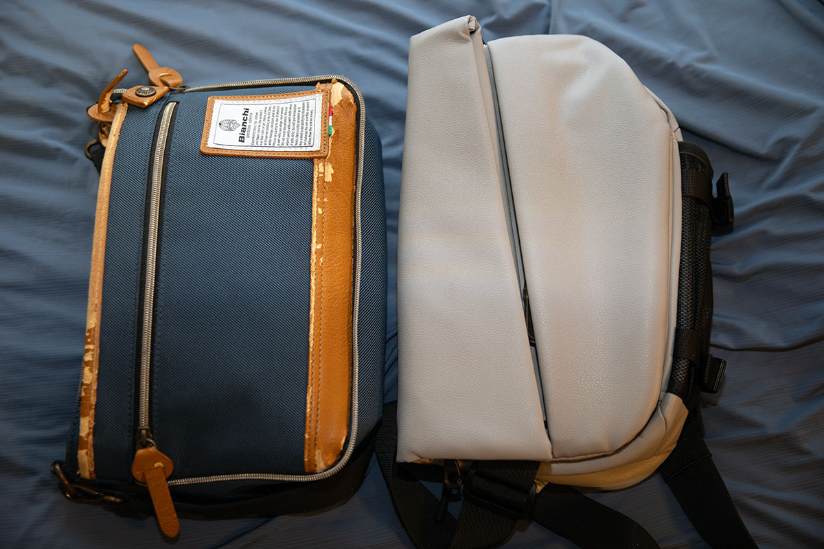 まずは自分用のスリングバッグを開けます。一般仕様はナイロンツイルなのですが、今回購入をしたのは初回のみの限定で航空機や高級車・ボートの内装に使われる合成皮革のロス素材とのことで、なかなかにソフトな肌触りで高級感があります。