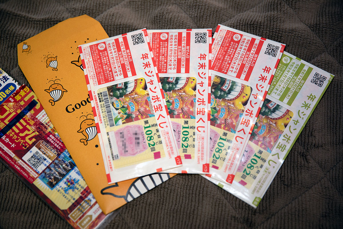 ヨドバシポイントの45,000ポイントを失い気分が落ち込んでいるので、取り返すべく年末ジャンボ宝くじを買ってみました。バラ連番30枚と連番10枚の計40枚で、12,000円分です。