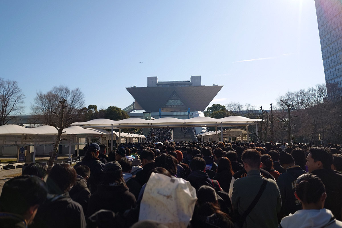 有明ビッグサイト近辺の駐車場は関係者で早朝から満車となりますので、収容台数が多く観光地のお台場へ車を入れ歩いてビッグサイトへと向かいます。りんかい線と新交通ゆりかもめでは1駅あるのですが、ビッグサイト前で降りても入場待機列は後ろの方まで延びており、結局1/2駅分くらいは歩かされるのでした。