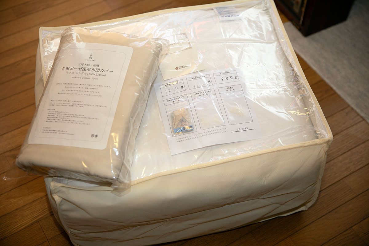 本来であれば、ガーゼケットとキャメル毛布に羽毛布団の3枚で、2月の一番寒い日でも暖かく寝られていたのですが、しかもみんな軽い。