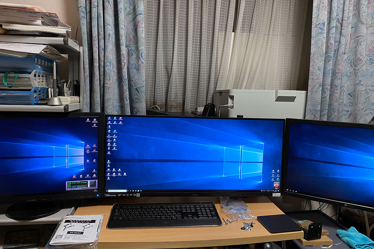 これまで自宅ではiiyamaの34インチウルトラワイド(3440×1440)を中心に、両側に昔から使っている古いモニターWUXGA(1920x1200)2台を繋げてこちらも3画面で運用していました。Windowを前後で切り換えずに済み、横並びで素早く行き来ができるので便利です。