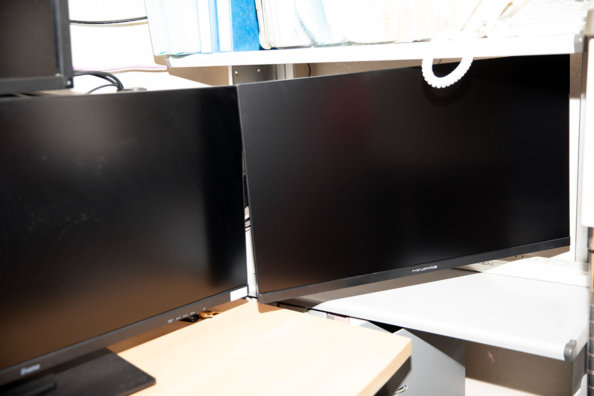 しかし今回は、モニターアームで吊りますので空中で自由な位置に固定ができ、綺麗な横並びにできています。モニター自体がすごく軽いので、安いモニターアームでも問題なく固定できています。