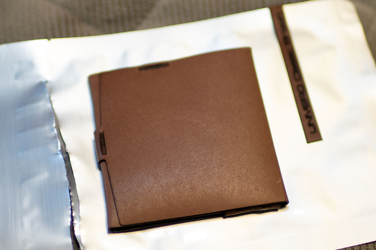 アルミパウチを破りますと、中にはそのままの裸極小財布「UNIVERO」が入っていました。ゴミは極力少なく、です。